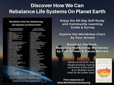 The Worldview Chart and introduction was created by Wahinkpe Topa (Four Arrows), a.k.a. Don Trent Jacobs, Ph.D., Ed.D. and originally published in The Red Road (chanku luta): Linking Diversity and Inclusion Initiatives to Indigenous Worldview, 2020. The chart is featured in Restoring the Kindship Worldview, 2022, by Four Arrows and Darcia Narvaez, Ph.D.